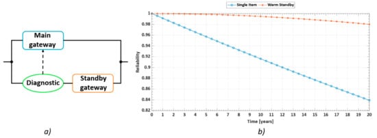 Proposed solution to achieve gateway fault tolerance: (a) illustrates the Reliability Block Diagram of the warm standby configuration.; (b) comparison between the reliability trends of a single gateway (blue curve) and of a fault tolerant warm standby comprising two gateways and a diagnostic system (red curve).