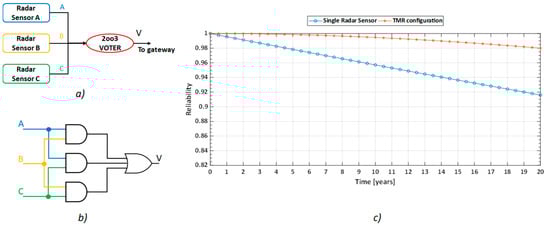 Regardless of the use of a fault tolerant gateway system, it is extremely important to ensure that redundant data comes from the sensors in each room. For this reason, a fault tolerant configuration has been developed also for the radar sensors installed in the various rooms of the house. Supposing that three sensors were installed in each room, a possible solution would be to use a Triple Modular Redundancy (TMR), in which all three sensors acquired data at the same time. Then, the sensors’ outputs are processed by a majority-voting system called Voter, which is able to produce a single output according to the three inputs. TMR is an advanced version of 2-out-of-3 (2oo3) architecture [], in case the Voter is not failure-free. If one out of three sensors in each room fails, then the Voter is able to generate a single output according to the response of the other two sensors. Therefore, when one of the three sensors fails, the outcomes of the other two are used to correct and mask the fault. Obviously, the most critical element of a TMR architecture is the majority-voting system because, in case of failure of this component, the benefits of redundancy will be nullified. For this reason, a reliability assessment of the Voter should be carried out carefully in order to ensure high reliability values of this component and to guarantee that the network will work as required. However, increasing the number of sensor nodes in a room, or in the entire residence, increases installation costs and reduces system simplicity. Figure 5 shows the proposed solution to achieve hardware fault tolerance for the three sensors installed in each room. Figure 5a shows the RBD of the TMR architecture. A possible solution to implement the 2oo3 majority-voting system (red circle in Figure 5a) is illustrated in Figure 5b, while, in Figure 5c, the reliability of the TMR fault tolerant architecture is compared with the reliability of a single sensor. In compliance with reliability handbook Telcordia SR 332–Issue 4 [], the failure rate of a single radar sensor has been set to 0.5 FPMH. Again, it is evident that redundancy helps to significantly improve system reliability.