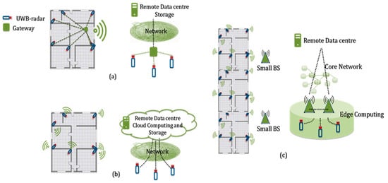 Overall network architecture: (a) hierarchical architecture; (b) UWB-radars directly connected; (c) architecture based on cellular features, such as 5G/6G.