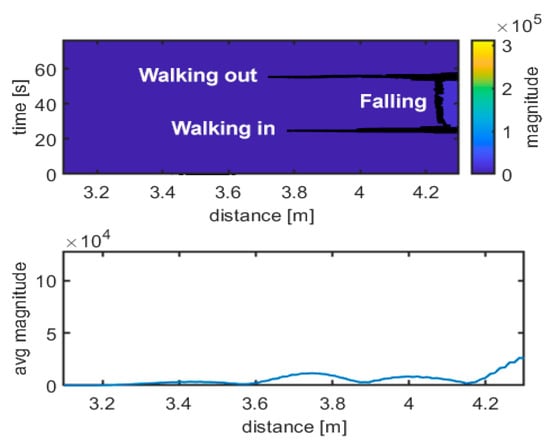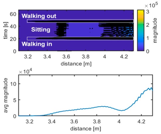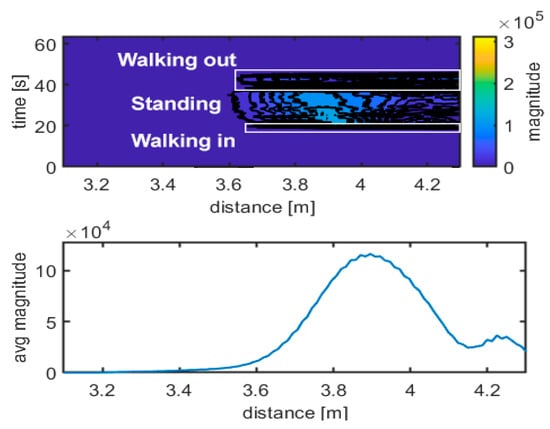 The upper graph in Figure 7 shows the difference between the data acquired from the specific movement and the empty room snapshot (template), calculated as described in Equation (2). In this case, walking in, standing frontside and walking out maneuvers can be easily distinguished, and they are shown. The different scheme of the radar traces is evident. The lower graph in Figure 7 shows the received radar echo, extracted from data and averaged over time during a steady interval (no movement). The shape of the signal is characteristic of the standing up position. Figure 8, Figure 9, Figure 10 and Figure 11 follow the corresponding presentation format for different movements and postures.