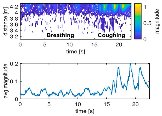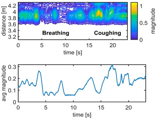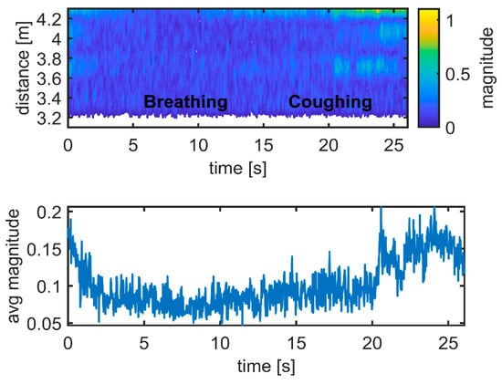 The upper graphs in Figure 10, Figure 11 and Figure 12 show the differences between the data and the empty room snapshot (Equation (2)) in a steady position (standing frontside, sitting, falling and lying down). Breathing and coughing patterns are extracted from the data. The magnitude of the processed data is here normalized to better highlight the peaks of breathing and coughing. In particular, the individual was breathing normally for 15 s (about 6–7 breaths) and then coughing for 10 s (about 5 coughs). The lower graphs in Figure 10, Figure 11 and Figure 12 show the received radar echoes averaged over time during the steady intervals (no movement) to measure breathing and coughing rates. The different scheme of the radar traces is evident, in particular when the individual is sitting. Breathing and coughing rates are not easily visible during standing (Figure 10), while they are evident during sitting (Figure 11). If the individual is lying down, it is not possible to extract breathing or coughing rates, as depicted in Figure 12, when exploiting the measurement setup used in this study (Figure 2).