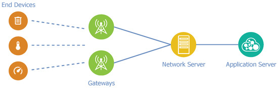 In the standard LoRaWAN network architecture that is depicted in Figure 2, the gateways are the closest section of the network from the end-device perspective. Each gateway acts as a passive area of the network, because it does not perform any computational operations. The gateway receives data from end-nodes and then converts packets into a form suitable for further transportation and processing. Subsequently, converted data are routed to the associated network server. The application server performs data processing, computing, and storage. The description shows that the computing model in LoRaWAN corresponds to the cloud computing paradigm.