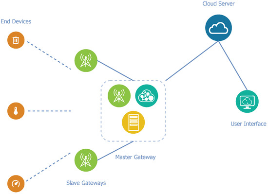 Master–slave is a communication model in which a single node (master) controls multiple slave nodes and mediates the communication between them. These master and slave nodes are gateways in this case. The slave gateways operate in the standard LoRaWAN gateway mode. In this mode, the slave gateway transfers each received message to the master gateway. The master gateway integrates the network and application servers to decrypt the payload and control packet relaying by the slave nodes.