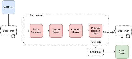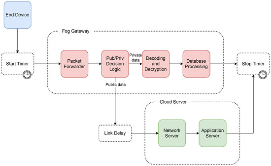 The proposed architecture C applies a different method, since the packet forwarder is specially modified to perform fog computing operations. In this case, the packet forwarder was designed to forward the data to a network server and additionally decode the messages and decrypt the payload. Therefore, it is necessary to add the execution times of individual fog computing functions that were performed by the gateway, i.e., message decoding (), payload decryption (), and subsequent storage of the payload to the database (), to the experimental measurement result of the execution time by the packet forwarder.
