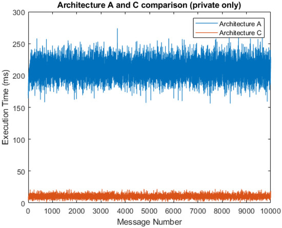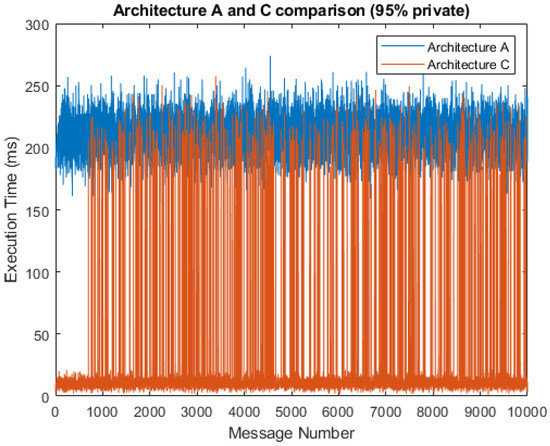 Figure 8 shows a comparison of the total service times that result from the simulation with a 5% probability of public messages. The chart shows that architecture C had a much shorter total message execution time, with the average service time being 19.44 ms as compared to 209.96 ms in architecture A. This, of course, only applied when private data predominated and primary data processing was done by the fog gateway, which is the principle of fog computing and the type of solution proposed in this study. Otherwise, the execution times for architecture A and C were almost identical. We can observe significant jumps in the execution time for architecture C, illustrating the transmission of messages to a public cloud server, where messages are then further processed. If the simulation is limited to only fog gateway processing, these jumps do not occur.