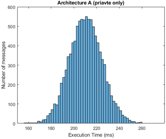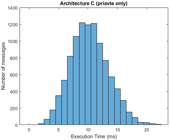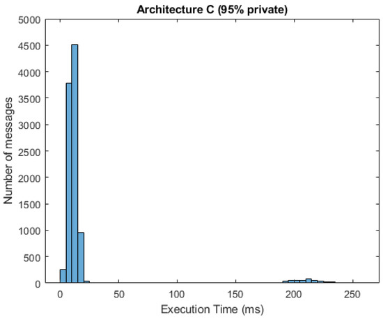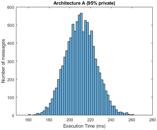 In Figure 10 and Figure 11, we can see respective histograms for architecture A and architecture C, with a 95% probability of private messages. A comparison of these histograms shows that while the total service time values for architecture A were not scattered significantly, the histogram for architecture C was dispersed, and the variance of these values was much higher as a result of the already mentioned difference in private and public processing. In Figure 12 and Figure 13, the histograms show the simulations for architectures A and C with a 100% probability of private messages. These histograms imply that, while the spread of the histogram for architecture A was almost the same in both cases, the variance of values that presented in the histogram for architecture C with a 95% probability of private messages was much higher than the case of only private processing. The simulation results summary of the individual proposed architectures can be seen in Table 4.