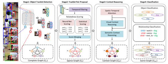 in Equation (2) means the weight can adjust the relative reflection ratio of neural net score and the statistical score according to the reliability of the two scoring methods. For the VidOR dataset, is set to 0.7 in the proposed model. Only object tracklet pairs with a total relatedness score higher than the threshold value () of 0.7 or higher than ) are proposed in this stage. In the TPP stage, all edges connecting two object tracklet nodes with no relationship or very low relationship are excluded from the complete graph to generate the sparse graph .