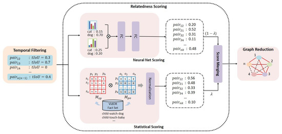 As the number n of object tracklets detected in the entire video range, not in each segment range, is very large, nC2 = n(n − 1)/2, which is the number of all possible object tracklet pairs, places a heavy burden on the overall VidSGG task. Therefore, a task is performed in the object tracklet pair proposal (TPP) stage of the proposed model to select only pairs of object tracks having a high relationship after evaluating the relatedness of each pair of object tracklets. The relatedness scoring for each pair of object tracklets is performed by combining the trained neural network-based evaluation and the dataset-based statistical scoring. Through this process, edges with low relatedness are excluded in the TPP stage from the complete graph obtained in the OTD stage, and a sparse graph that is more compact is generated. The mechanism of object tracklet pair proposal of the proposed model, VSGG-Net, is schematically shown in Figure 3.