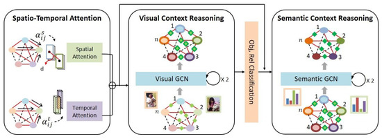 As shown in Figure 4, the context reasoning process of VSGG-Net is largely composed of the following stages: spatio-temporal attention, visual context reasoning, and semantic context reasoning. Visual context reasoning uses the visual information of each object tracklet, whereas semantic context reasoning uses the class distribution value of each object tracklet, which is the result of visual context reasoning. Therefore, the CR process of the proposed model is a hierarchical reasoning process consisting of lower-level visual context reasoning and higher-level semantic context reasoning. In addition, the CR of each level is performed iteratively using pre-calculated spatial attention , temporal attention , and the GCN [21]. The GCN repeats the process of updating to include sufficient spatio-temporal contexts in each node by reflecting information of neighboring nodes to each node based on the temporal attention and the spatial attention. In the proposed model, a context graph is first constructed to perform CR. The context graph has two types of nodes, an object node, and a relationship node. It also has three types of edges that connect the pairs of (subject node, relationship node), (relationship node, object node), and (subject node, object node), respectively. Unlike the existing GCN [21], the spatio-temporal GCN of the proposed model not only uses the spatial attention and the temporal attention , but also enables exchanging information between the node pairs (subject node, relationship node) and (relationship node, object node) as well as (subject node, object node) through the three types of edges.