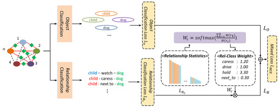 In datasets such as VidOR and VidVRD, there are relationships that appear with high frequency, such as “next_to” and “in_front_of”, as well as many relationships appearing at a low frequency, such as “cut” and “shake_hand_with." Relationships with a low frequency of appearance inevitably have a lower recognition rate compared to those with a high frequency of appearance in the relationship classification process. In the ORC stage of VSGG-Net, a relationship class weighting technique, as shown in Equation (8), is applied to solve the long-tailed relationship distribution problem. This technique adjusts the weight of the loss of the relationship class in the loss function according to the frequency of appearance. According to this technique, the lower the frequency of appearance, the higher the weight of the relationship loss in the loss function, as shown in Equation (8). In Equation (8), denotes the number of relationship instances corresponding to the relationship class in the training dataset, and denotes the weight of the relationship class in the loss function for learning the relationship classifier.