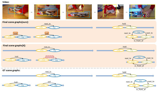 Figure 6 is an example of VSGG-Net generating correct scene graphs from the input video to match the ground truth scene graphs. Only two objects appeared in this scene, “child” and “toy.” All relationships detected by VSGG-Net, such as <child-next_to-toy>, <child-hold-toy>, <child-pull-toy>, <child-hold-toy>, <child-in_front_of-toy>, <toy-next_to-child>, and <toy-next_to-toy>, match with the ground truths not only in terms of the triplets but also in terms of the temporal ranges of the relationship. Such results show the relatively high object tracklet detection performance and tracklet pair proposal performance of the proposed model. In addition, the proposed model predicted the two action relationships <child-hold-toy> and <child-pull-toy> in order by effectively utilizing temporal context information by context reasoning. However, the existing MAGUS.Gamma model [4] did not detect the relationship <child-pull-toy> following <child-hold-toy>, because it could not make use of temporal context information. The results show the power of our VSGG-Net’s context reasoning capability.