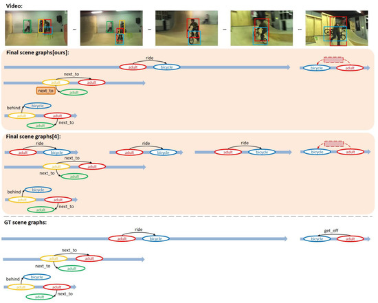 In order to qualitatively evaluate the performance of VSGG-Net, some examples in which the proposed model generated a scene graph among VidOR benchmark data are used. In Figure 6, Figure 7 and Figure 8, the upper part of each image shows the input video, the middle part shows the final generated scene graphs, and the lower part shows the ground truth scene graphs.