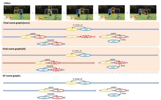 In Figure 8, the proposed model detected characters and spatial relationships, such as “in_front_of” and “towards” well. However, the temporal range of the behavioral relationship <child-watch-ball> detected by the proposed model did not extend for long from the beginning of the video to the middle, ending shortly in the middle. This happened due to the following reason. First, the object “ball” was hidden by another object “child” in the middle of the video, disappearing from the video for a while and then reappearing. Therefore, the object tracklet detector of the proposed model could not detect the tracklet of the longer “ball” including the section where the “ball” temporarily disappeared. For this reason, the proposed model only detected a shorter temporal range of the <child-watch-ball> relationship. Current object detection technology and object tracking technology that rely only on visual input cannot solve this problem realistically. Only by applying commonsense reasoning based on the scenes before and after the section where the object disappears from the video will we be able to estimate the position and size of the object during the section of disappearance. Technology that can accurately predict the scene, including the disappeared objects during a specific section of the video based on the scenes before and after the section, is expected to further enhance the ability of the proposed model to comprehend a video. The MAGUS.Gamma model [4] erroneously detected “ball” as “toy” from the beginning of the video. Therefore, the model could not also detect relationships including the object “toy”. The results emphasize the importance of object tracklet detection in video scene graph generation task.