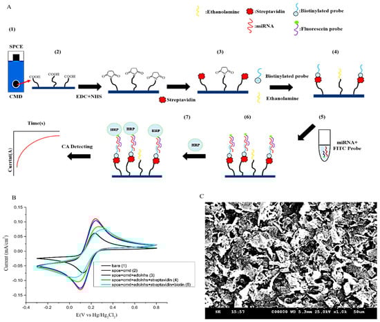 Establishment of the miR biosensor. (A) Schematic representation of the fabrication and operation of the miR biosensor, starting with (1) the process of creating the screen-printed carbon electrode (SPCE) for the detection of miR-141. (2) CMD was then used to modify the SPCE to provide the reactive groups, followed by EDC and NHS crosslinking to the electrode. (3) Streptavidin was subsequently added to the electrode. (4) After this, the biotinylated probe was immobilized onto streptavidin, with ethanolamine occupying the remaining SPCE surface. (5) In order to detect the miR-141, pretreatment of miRNA and the fluorescein-modified detection probe (FITC probe) was conducted in a separate medium. (6) The addition of the miR-141/FITC probe complex to the functional SPCE surface allowed for hybridization. (7) With the addition of anti-fluorescein horseradish peroxidase (HRP), a catalyzed redox reaction occurs between tetramethylbenzidine (TMB) and H2O2 at the surface of the electrode. (B) Generating electrochemical signals (CA currents) in every step; without the presence of miR-141, no CA currents would be generated. (C) SEM image showing the surface of SPCE after all modification steps.