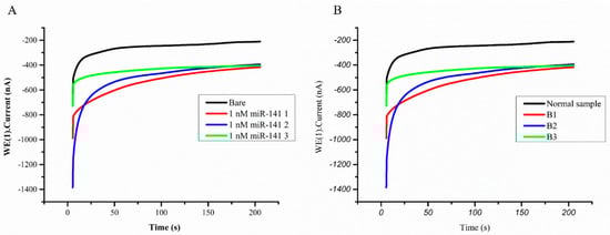 The reliability of the miR biosensor after optimization of the experimental conditions was defined by the comparison of CA current between normal and miR-141-positive samples. The minimum and maximum currents measured in miR-141-positive samples were 138 and 362 nA, respectively. Control samples with no miR-141 presence had a range from 95 to 183 nA (Figure 2). As shown, the maximum current from the miR-141-positive samples was double that of the control samples. We recognized the overlap of higher-amplitude currents of control samples and the lower amplitudes of miR-141 samples. A sensitivity evaluation of the miR biosensor was then carried out using artificially synthesized sequences of miR-141, with test concentrations ranging from 10−8 to 10−12 M. The results were close to exact linearity on the calibration plot (R2 = 0.9951) (Figure S1). We further compared the limitation of detection (LOD) for similar sensor devices previously developed for miR-141 detection, which applied serum samples and where sensor detection was based on target-induced fluorescence enhancement and PicoGreen. The detection limits of the biosensor for miR-141 were 70 and 113.8 nmol L−1 in deionized water and serum samples, respectively [32].