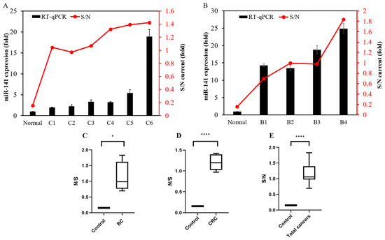 The minimum and maximum currents from the bare sample to 1 nM of mimic miR-141 were 138 and 400 nA, respectively (Figure 2A), corresponding to a range of urinary miR-141 concentrations between 10−8 and 10−12 M (Figure S1) (see Supplementary Material). qPCR was employed as a reference for accuracy, which showed the consistency of the miR biosensor. In comparison with the control cases, samples derived from CRC and BC patients presented results that were statistically significant at p < 0.0001 and 0.0076, respectively.