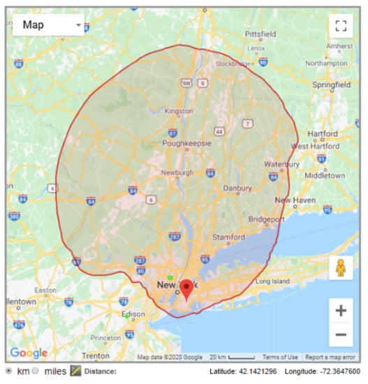 Using an LS Telcom database example, Figure 1 shows the exclusion zone for a vacant channel near New York city, US []. Since the exclusion zone is determined based on coverage prediction, it may not represent the actual coverage area of the PU signal, and may not be updated in real time. Moreover, such concept of exclusion zone does not take into account that an SU on its edge, but outside it, may cause harmful interference in a PU inside the zone. It must be also taken into consideration that interference levels from the PUs are also determined based on signal propagation predictions, thus being prone to the intrinsic inaccuracy of such methods.