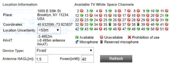 As another example of a WSDB-assisted spectrum occupancy information, Figure 2 shows the channel availability at a given location in Brooklyn, New York city, US. This data can be retrieved from the LS Telcom database upon providing the coordinates, with a location uncertainty that must be less than 50 m, the device type, and the transmitted power and antenna height above ground level (HAGL) [].