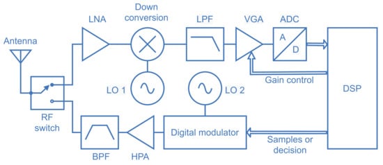 To illustrate the practical aspects of spectrum sensing and show a possible internal structure of the spectrum sensing module of the SSIoT device, Figure 3 presents the diagram of a direct-conversion spectrum sensor, which is suited for software-defined radio (SDR) receivers and monolithic integration []. The sensed signal is captured by the antenna and directed to the low noise amplifier (LNA) through an RF switch []. The signal at the output of the LNA is down-converted to baseband by means of the multiplier (mixer) and the local oscillator 1 (LO 1); the LO 1 frequency determines the spectral location of the band to be sensed. The result goes through a lowpass filter (LPF) that limits the signal bandwidth and avoids aliasing. A variable gain amplifier (VGA) maintains the signal excursion within the dynamic range of the analog-to-digital converter (ADC), with the help of control bits coming from the digital signal processor (DSP). The bits representing the received signal then goes to the DSP, where the digitized received samples are just conditioned (in the case of data-fusion) or the test statistic is formed and the SU’s local decision is made (in the case of decision-fusion). The samples or decisions are sent to a digital modulator whose center frequency is determined by the LO 2, depending on the center frequency of the control channel used to communicate with the fusion center. The modulated signal goes through a high power amplifier (HPA) whose output signal is filtered by a bandpass filter (BPF). The resultant signal is then sent to the antenna via the RF switch, which is now in the opposite state. The target receiver is the fusion center.