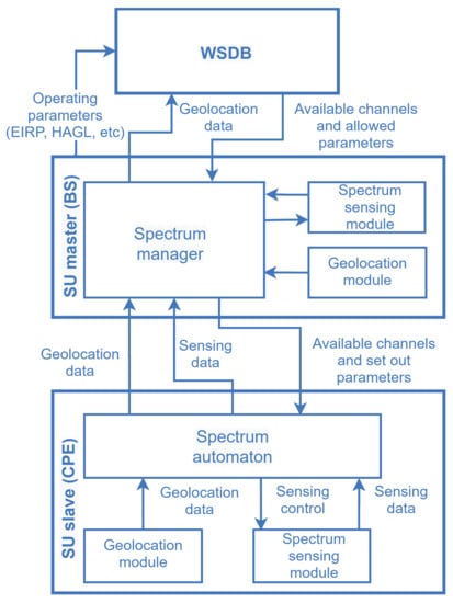 To accomplish opportunistic DSA, three main approaches may be adopted. In the first, the SUs discover about free bands by querying an spectrum occupancy database where it is stored a list of available channels. This repository is often referred to as a geolocation database (GLDB) [] or a white-space database (WSDB) [], the latter being the most adopted term by the Institute of Electrical and Electronic Engineers (IEEE) [], by the Federal Communications Commission (FCC) in the United States (US), and by the Office of Communications (Ofcom) in the United Kingdom (UK) [,]. In the second approach, a spectrum monitoring technique known as spectrum sensing [,] is applied to seek for vacant bands for subsequent opportunistic access by the SUs (D2). In the third approach, as specified by the IEEE 802.22 standard [], the spectrum sensing information coming from the sensing automation process in the customer premises equipment (CPE), as well as the channel availability map retrieved from the WSDB, can be combined by the spectrum manager in the base station (BS). The final decision upon the occupation state of the targeted band is made taking into account both information. Regardless of the employed approach, reliability and consistency of spectrum information and opportunistic decisions are required (D3).