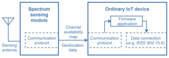One of the main features of the framework is that the spectrum sensing task conventionally carried out by the SUs is shifted to SSIoT devices that are part of a supporting IoT network, reducing the complexity of the SUs. The SSIoT devices are formed by the connection of an ordinary IoT device with a spectrum sensor (SS) module, via a standard hardwired or wireless interface such as UART, I2C, or SPI [], as depicted in Figure 6. The SS module sends the spectrum sensing information to the attached IoT device, along with the geolocation data if the IoT device is not equipped with a positioning feature. Subsequently, the main application layer catches the spectrum sensing information and forwards it to the gateway, and then to the WSDB.