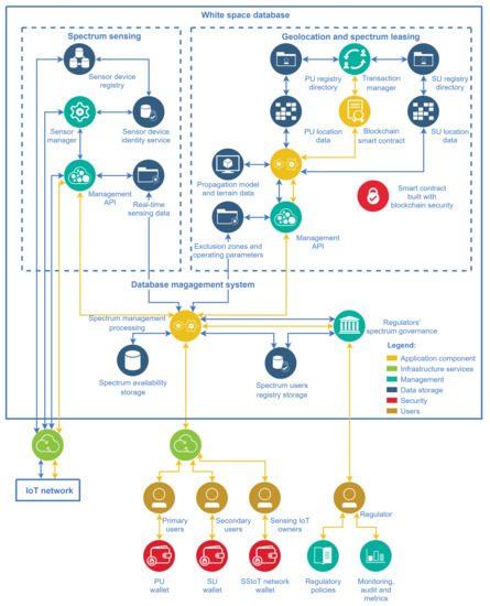 The entities comprising the database-driven IoT-enabled dynamic spectrum access framework and their relationships are presented in Figure 5. All networks considered in this figure are assumed to be deployed in the same region, meaning that they have coverages in common.