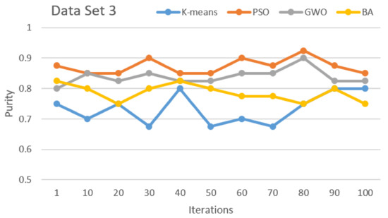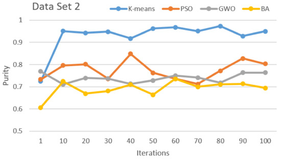 Figure 3 shows the comparison of the algorithms with data set 2. This result clearly shows that K-means has the best performance over the others and the second best is PSO. GWO and BA have third and fourth positions, respectively. Only for iteration number 1 was less purity observed and for the remaining iterations, stable purity is observed.
