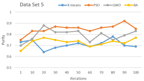 Figure 5 and Figure 6 show a comparison of the algorithms based on data sets 4 and 5, respectively. Here, based on purity results, almost the same results are shown that PSO and GWO perform first and second, respectively. BA and K-means show almost equal and lower performance than PSO and GWO.