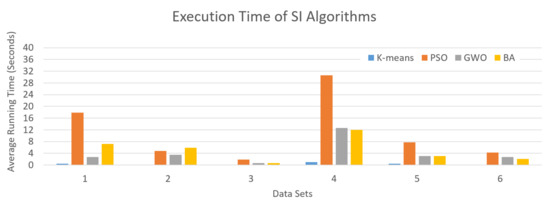 As shown in Figure 8, the average of the total running time of SI algorithms in each data set was used to evaluate the computational efficiency of the algorithms. Here, K-means is much faster than PSO, GWO, and BA with shorter average running time which is less than a second. Here, PSO takes 17.92, 4.83, 1.83, 30.6, 7.8, and 4.21 average running times in seconds for executing data sets 1, 2, 3, 4, 5, and 6, respectively. This is comparatively more execution time than other algorithms. GWO and BA have an almost equal average running time for all data sets and are faster than the PSO algorithm. Although the PSO has a longer execution time, other evaluation metrics show that the performance of PSO is better at finding the optimum solution.