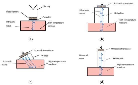 Ultrasonic transducers for extreme conditions: (a) with a thin protective layer; (b) with a delay line; (c) with a wedge; (d) with a waveguide.