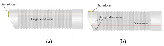 The transducers with buffer rods shown in Figure 5 are of two different types. In the transducer presented in Figure 5a, a longitudinal wave is directly generated by the thickness mode piezoelectric element attached to the end of the buffer rod. For some high temperature measurements, for example for thickness monitoring, shear waves are applied. The second type of the transducer can be used for such purpose. The shear wave is obtained after reflection of the longitudinal wave from the inclined surface of the tip of the buffer rod (Figure 5b). An advantage of the latter design is that for excitation of the shear wave a conventional longitudinal mode transducer can be used. Influence of temperature gradients on propagation of longitudinal and shear waves in the buffer rods was analyzed by us in [51].