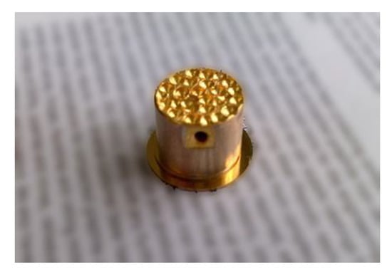 In the case of monitoring of high temperature substances such as melted plastics, the buffer rod must contact the liquid plastic flowing inside a high-pressure pipe [5,47]. For that the rod is screwed via the standard port ½-20UNF-2A into a wall of the pipe. Considering that for reduction of trailing waves the shape of the rod is tapered to the diameter of the smallest rod tip, defined by the diameter of the standard port, which in this case is 8 mm. Propagation of ultrasonic waves in such rod was analyzed in [48,49]. The buffer rod is made of stainless steel AISI 316 or titanium Gr.2. The image of such high temperature transducer with the tapered rod suitable for insertion via standard port is shown in Figure 4.