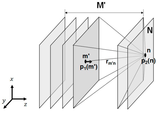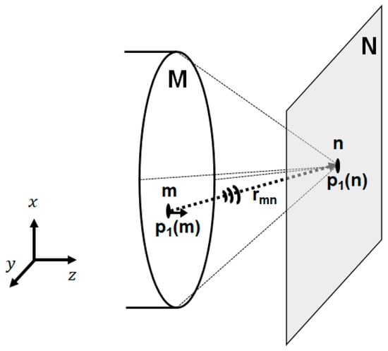 As shown in Figure 1, the ultrasonic wave generated at a certain small point (m) on the transducer surface (M) reaches a certain small point (n) in the target field (N). The ultrasonic wave at point n can then be determined by the summation of the ultrasonic waves from all of the small points on the transducer surface (M). Thus, the pressure can be expressed by pressure at the point m on the transducer as follows [20]:
