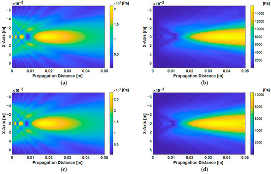 Figure 3a,b show the calculated ultrasonic pressure fields of the fundamental and second harmonic waves in fused silica as the x-z cross-sectional distribution, the material parameters of which are , and . Figure 3c,d show them in the Al6061-T6, the material parameters of which are , and [27]. The diameter of the transducer is 0.375 in and the driving frequency is 5 MHz and was given as .