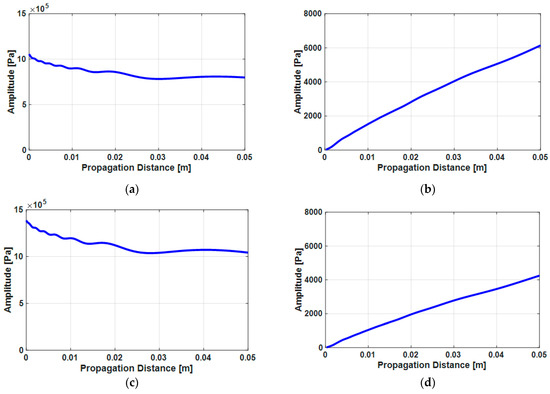 Here, the received pressure amplitude can be calculated as the average pressure of all of the points belonging to the receiving transducer surface. Figure 4 shows the received pressure amplitude of the fused silica and the Al6061-T6 when the receiver transducer is the same size as the transmitter transducer (0.375 in). Figure 4a,b are the received fundamental and second harmonic amplitudes in the fused silica and c and d are those in the Al6061-T6. The fundamental amplitude decreases due to the diffraction effect but the second harmonic amplitude increases according to the propagation distance because of the growth of the second harmonic component by the material even though it also includes the diffraction effect.