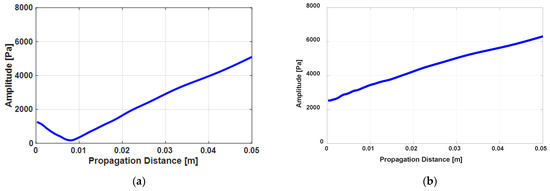 Meanwhile, in general, the second harmonic wave by material nonlinearity has the same phase as the incident second harmonic wave; however, there is a special case in which their phases are opposite to each other such as in fused silica. To consider this, the phase of the incident second harmonic wave can be changed in the calculation. Figure 5 shows the received pressure amplitude of the second harmonic wave when is −1.0 × 10−13 in fused silica and 1.0 × 10−13 in the Al6061-T6. The calculated incident second harmonic pressure amplitude at z = 0 is 1.24 kPa in Figure 5a and 2.49 kPa in Figure 5b.