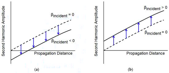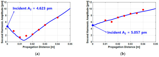 On the other hand, if the incident second harmonic is opposite to the phase with the second harmonic generated by the material, the amplitude of the received second harmonic initially tends to decrease and then increase again from a certain propagation distance, as shown in Figure 9. If this phenomenon occurs in the experimental data, the phase of the incident second harmonic and the second harmonic generated from the material are opposite so a theoretical calculation model with the phase of the incident second harmonic as negative, as shown in Figure 7b, should be used.
