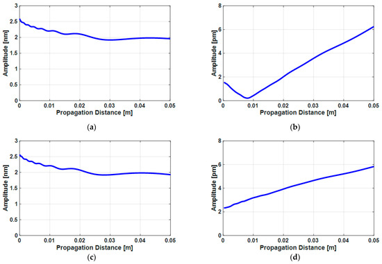 The numerical calculation results of the received displacement amplitude of fundamental wave calculated using Equation (8) at a frequency of 5 MHz and the second harmonic wave calculated using Equation (9) at the frequency of 10 MHz according to the propagation distance: (a) the fundamental wave and (b) the second harmonic wave in fused silica and (c) the fundamental wave and (d) the second harmonic wave in the Al6061-T6.
