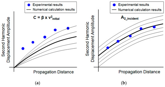 Next, for the case where the incident second harmonic exists, calculate the displacement amplitude of the second harmonic wave according to the propagation distance as shown in Figure 7d by using Equation (9). In this case, the incident second harmonic amplitude is unknown so it remains as a variable. Figure 8b shows the calculation results for several different incident second harmonic amplitudes and the amplitude that best matched the curve is selected. The incident second harmonic amplitude is then determined by the value of the starting point of the matched curve.