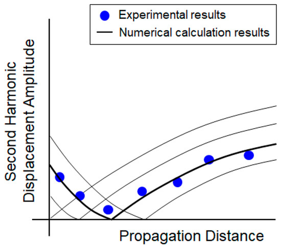 To obtain an accurate acoustic nonlinearity parameter, , the displacement amplitude of the incident second harmonic wave, , must be removed from the displacement amplitude of the received second harmonic, , in Equation (9). For this, we propose a method of fitting the aforementioned theoretical calculation model to the change in the amplitude of the second harmonic wave according to the change in propagation distance obtained experimentally. This method consists of two steps and its schematic is shown in Figure 8.