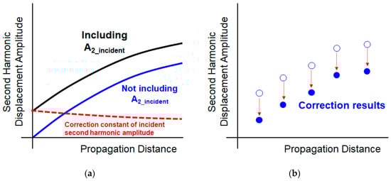 Finally, the correction factor is obtained from the difference between the two theoretical models that, respectively, include and do not include the incident second harmonic component, which is obtained in the estimation process, as shown Figure 10a. This component is subtracted from the experimental data to obtain the final second harmonic displacement amplitude, as shown in Figure 10b.