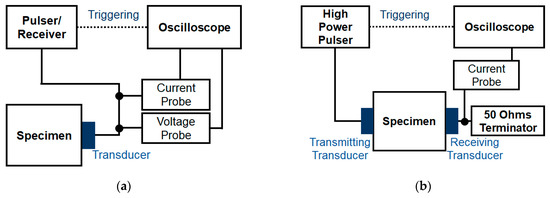 In the calibration measurement, the broadband signal is generally employed to obtain the transfer function over a wide frequency range that includes the fundamental and second harmonic frequencies. For this, a pulser-receiver (5072PR, Olympus) that could drive the spike pulse up to 400 V was employed. The current and voltage probes were set between the pulser-receiver and the transducer to measure the input signal and first echo signal. For the harmonic measurement, a high-power pulser (RAM-5000-M4, RITEC Inc.) to drive a 20-cycle tone-burst signal with 5 MHz was employed. The current probe was set between the receiving transducer and a 50 ohms terminator to collect the ultrasonic signal. In both measurements, a voltage probe (P5100A, Tektronix) with a 500 MHz bandwidth up to 2.5 kV and a current probe (CP030, Teledyne LeCroy) with a 50 MHz bandwidth up to 30 A were used. An oscilloscope (HDO4034A, Teledyne LeCroy) with a 12 bit resolution and 10 GS/s collected all of the signals from the probes in the condition of full-scale height over 80%. A 5 MHz transducer was used as the transmitter with a 3.20 to 6.90 MHz bandwidth and a 10 MHz transducer with a 4.95 to 11.90 MHz bandwidth was used as the receiver to sensitively detect second harmonic waves; both were 0.375 in in size. Fused silica and Al6061-T6 specimens were prepared with various thicknesses (fused silica: 5, 10, 15, 20, 25, 30, 40 mm; Al6061-T6: 10, 15, 20, 25, 30, 35, 40 mm). Note that in all experiments, a contact pressure of about 300 kPa was applied to the transducer using a specially designed pneumatic system to maintain the same contact condition between the transducer and the specimen [28].
