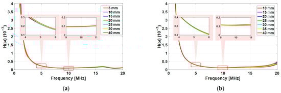 First, for the case where the incident second harmonic does not exist (), calculate the pressure amplitude of the second harmonic according to the propagation distance, as shown in Figure 4b or Figure 4d, by using Equation (4) with the material to be tested and the experimental conditions and then, using Equation (9), calculate the displacement amplitude. In this case, the nonlinear parameter and the initial velocity are unknown so they remain as variables. Here, because the curve trend changes proportionally according to the product of and squared , the unified coefficient C defined in Equation (10) is used in the estimation process:
