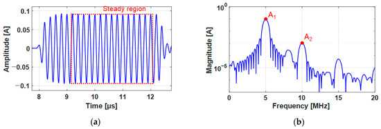 Figure 13a shows the received signal from the current probe in the harmonic measurement where the static component was removed beforehand. The signal processing was performed for only the signal in the steady region where the amplitude remained constant. Figure 13b is the fast Fourier transform of the selected signal in which the second harmonic component was clearly detected. The fundamental and second harmonic displacement amplitudes were calculated using the transfer function at 5 and 10 MHz and the current signal amplitudes at 5 and 10 MHz in the received signal using Equation (12). Meanwhile, we could see third and fourth harmonics at 15 MHz and 20 MHz, respectively, which could be also generated by the nonlinear characteristics of the material but they were out of our interest.