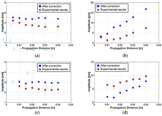 Figure 15 shows the correction results of the fundamental and second harmonic amplitudes; a and b are for the fused silica specimens and c and d are for the Al6061-T6 specimens. In Figure 15a,c, for fundamental amplitudes, the red dots represent the experimental data and the blue squares are the diffraction corrections. We could see that the correction results were almost constant regardless of the propagation distance. In Figure 15b,d for the second harmonic amplitudes, the red dots represent the experimental data and the blue squares are after the correction of the diffraction and the incident second harmonic component. In the case of fused silica, the amplitude of the second harmonic generated by the material nonlinearity was subtracted by the incident component whose phase was opposite and the detected amplitude decreased. Therefore, if we compensated for this, it increased to its original amplitude. On the other hand, in the Al6061-T6, as the phase of the second harmonic generated by the material nonlinearity and the incident component were the same, the detected magnitude increased. Therefore, it became smaller after the correction.