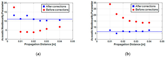 Figure 16 shows the results of the absolute acoustic nonlinearity parameter obtained from the results in Figure 15. The red dots are before the correction and the blue squares are the results after the correction; the results after correction were significantly more stable than those before the correction. Table 1 compares the averaged values of the acoustic nonlinearity parameters for each propagation distance obtained after calibration with the values reported in the literature. The results of the fused silica were similar to those in the literature while those of the Al6061-T6 were slightly higher than in the literature. However, the latter could be considered reasonable considering the deviation of the measured values of the nonlinearity parameter of Al6061-T6 reported in the literature.