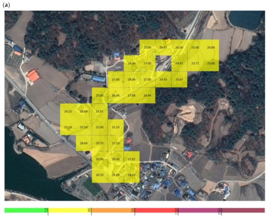 The locations used to measure the background concentration for X quarry were 1.7 km from the quarry and were selected because they were not affected by the quarry according to the preliminary investigation. The total measurement area was 90,336.8 m2 and the average grid size of the area that could be detected by the dust measurement sensor was 39.8 m (width) × 39.8 m (length), resulting in an area of 1584.9 m2. Measurements were performed over a period of 33 min 52 s (from 14:21:25 to 14:55:17 on 10 September), and a total of 2032 datapoints were collected (Figure 4).