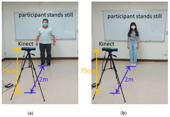 The Kinect device was made by Microsoft (Microsoft Inc., Redmond, WA, USA). It recorded joint node locations and was connected to a personal computer–based signal processing system. A data point of a joint node signal includes X, Y, and Z coordinates. Only X and Y coordinates were considered in this study because when standing still, vertical movement is negligible. The signals of the joint nodes were recorded at a frequency of 30 Hz.