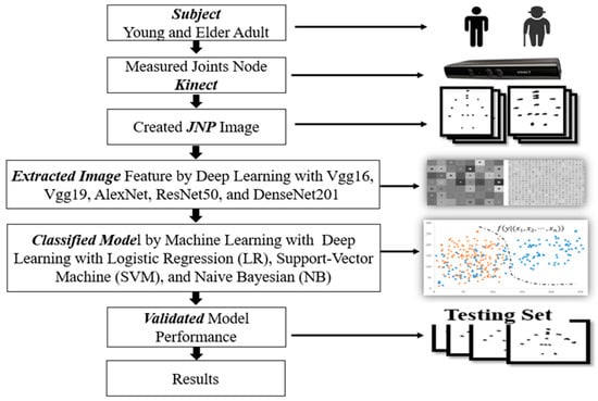 The study flowchart includes the participants coordinates of joint nodes measured by Kinect, creation of joint node images with the coordinates, features extracted from images, and training of the classification models. The models were validated with a testing set, and the final results were recorded (Figure 2).