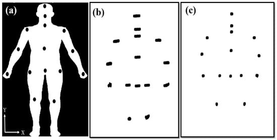 The 15 joints were recorded by Kinect for 40 s (Figure 3a). However, the 1200 coordinates (X, Y) of the joints were recorded over 40 s. Hence, the JNP was created to observe postural control and examine stability over a period of 40 s (Figure 3b,c). The JNPs clearly visualized good or poor postural control and provided positioning information for the deep and machine learning approaches.